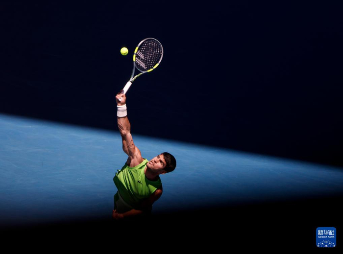 1月21日,西班牙选手阿尔卡拉斯在比赛中发球。